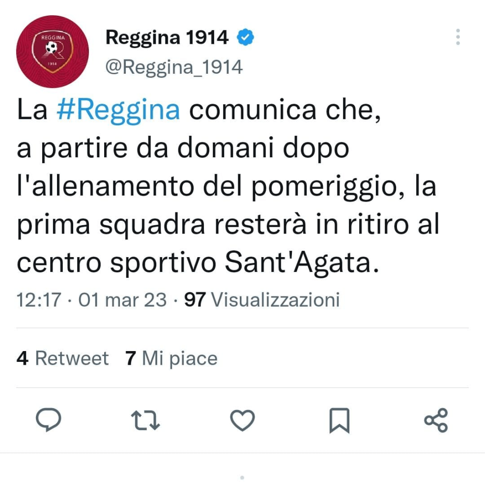 Da oggi , dopo l’allenamento previsto nel pomeriggio, la Reggina 1914 imporrà ai propri tesserati il ritiro fino a nuovo ordine che – verosimilmente – coinciderà con la gara casalinga col Parma in programma sabato 4 marzo alle 16.15. All’indomani della cocente sconfitta maturata nei minuti finali del derby col Cosenza, la società ha preso questa decisione drastica (quanto si voglia) ma assolutamente necessaria per isolare la squadra nella sua interezza