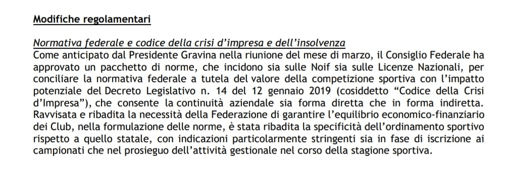 La FIGC si evolve, finalmente. Sebbene metta in primo piano la sua specifica autonomia rispetto alle Leggi dello Stato, alla fine si è “dovuta dare una mossa” mettendo in atto alcune modifiche non da poco. Nella giornata di ieri, infatti, l’organo sportivo ha approvato le norme per conciliare gli effetti dell’impatto potenziale del “Codice di Crisi di Impresa” con le norme federali, a tutela del valore della competizione sportiva fermo restando misure molto più stringenti sia in fase d’iscrizione ai campionati che – e soprattutto – in quella riguardante l’attività gestionale.