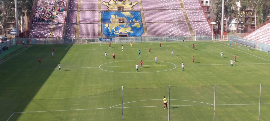 Ma ritorniamo “a bomba”: 4-3-3 per la compagine amaranto nella quale c’è da segnalare il rientro di Martiner sulla dorsale di destra con Rosseti e Perri preferiti a Bolzicco e Renelus. Stesso modulo per Eugenio Lu Vito – tecnico siciliano che da due giornate ha sostituito Passiatore (ex calciatore amaranto) – che manda in campo: La Cagnina tra i pali; Brumat, Parisi, Duli e Samake a formare la linea difensiva; Siino, Calabrese e Dampha sulla mediana; Mazza, Varela e Durmush in attacco. Buona la presenza dei tifosi ospiti quantificati in un centinaio di presenze mentre la Curva Sud presenta ampi spazi vuoti e desolanti.