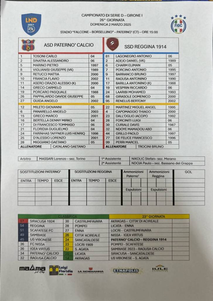 Al 65’ Grillo – entrato al posto di Renelus, oggi in evidente difficoltà – effettua un cross in area per Barillà che di testa coglie una clamorosa traversa. E, dopo la girandola di sostituzioni e ben 7 minuti di recupero, la Reggina porta via da Paternò tre punti d’oro su un campo ostico, su un terreno di gioco da terza categoria e contro una squadra che fa della scorrettezza la sua arma migliore.