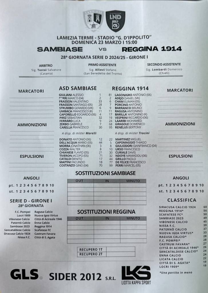 COMMENTO FINALE – Che non sarebbe stata una gara dalla facile lettura era da mettere in conto così come preventivabile che il Sambiase non avrebbe regalato nulla ad una Reggina che ha sofferto oltremodo il gioco ostruzionistico. L’impressione, in un primo tempo estremamente bloccato, è stata quella che solamente un episodio avrebbe potuto variare le sorti della partita. Nonostante ciò, sull’angusto campo di gioco lametino, si è vista solo la Reggina che ha confezionato due palle gol col portiere avversario sugli scudi. C’è da sottolineare che Morelli, tecnico giallorosso, ha provveduto a francabollare sistematicamente le fonti del gioco amaranto, facendo marcare a uomo Barillà, Porcino e Laaribi ossia le vere menti del centrocampo ospite che oggi non ha avuto (quindi) lo spunto giusto o quel guizzo tale da spaccare la partita. Ma la Reggina fa la Reggina e, sui titoli di coda, vince grazie al suo Capitano lesto a battere il portiere avversario. Si va avanti quindi con il Siracusa avanti di quattro punti ma con una partita in meno a disposizione degli aretusei. La vittoria contro il Sambiase rimarrà impressa nella mente per la pazienza e la saggezza dei giocatori amaranto che hanno aspettato il momento propizio per tramortire l’avversario. Questo, se permettete, fa ben sperare anche perché il Siracusa – lo vogliamo sottolineare – ha perso su questo campo e contro questo avversario sconveniente e scontroso
