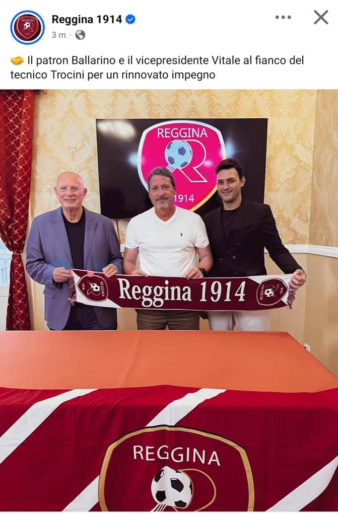 “AS Reggina 1914 comunica la firma del prolungamento del contratto di mister Bruno Trocini, che si lega al club amaranto fino al 30 giugno 2026 con opzione di rinnovo automatico in caso di promozione. Arrivato alla guida del club nel corso della passata stagione, mister Trocini ha saputo imprimere fin da subito la sua impronta alla squadra, distinguendosi per competenza e profondo senso di appartenenza ai colori amaranto. La società augura al mister e al suo staff un proficuo lavoro, con l’auspicio di raggiungere insieme importanti traguardi sportivi”.