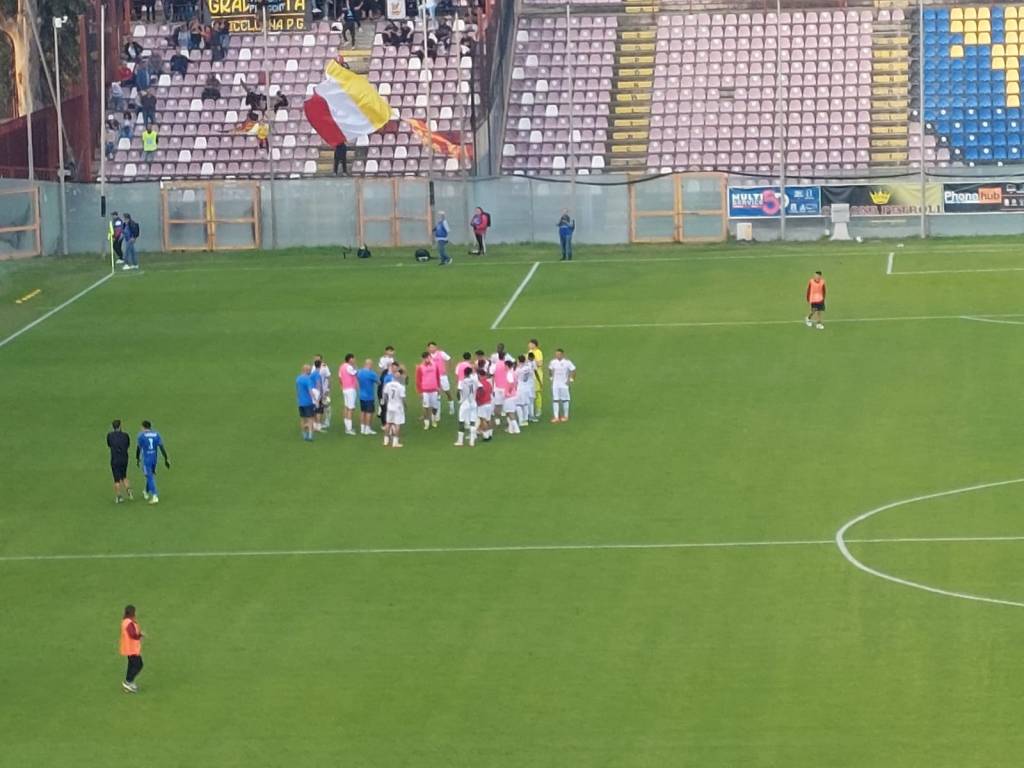 Nonostante la buona presenza dei sostenitori amaranto (4500 circa) assiepati soprattutto nella “mitica” Curva Sud, gli ultras chiedono un maggiore impegno da parte dei giocatori con la casacca amaranto con cori, canti e striscioni. Contro la prima classe, ovviamente, serve una prestazione gagliarda da giocare con grande determinazione e quella dose di cattiveria sportiva che non guasta mai per cui i ragazzi della Sud non chiedono certamente la luna. Reggina subito pericolosa con Montalto che chiama alla parata il portiere avversario seguito qualche attimo dopo da Grillo che conclude alto di poco. Si intravede fin da subito che la squadra in casacca amaranto verticalizza con una certa (e finora sconosciuta) velocità mettendo fin da subito alle strette la formazione di Marra. Poco dopo sono gli ospiti a rendersi pericolosi con Joao Pedro il quale, però, non si coordina e permette alla difesa di casa di sventare l’insidia. In base a quanto si è potuto vedere in questo scorcio iniziale di gara, la Nuova Igea merita ampiamente la posizione che occupa grazie ad una intelaiatura organizzata, un sistema di gioco ben congegnato e con la bravura di elementi di grande spessore per la categoria come Balzano, Squillace, Calafiore, Samake (oggi abbastanza nervoso e con un giallo dopo 12 minuti) e Joao Pedro anch’esso sanzionato con un giallo a metà primo tempo per l’eccessiva veemenza nei suoi interventi. Nonostante ciò, è ancora Montalto in acrobazia a scaldare i guantoni a De Falco in una gara tutto sommato equilibrata. Al 38’ ospiti vicini al vantaggio con un colpo di testa di Samake servito magistralmente da Joao Pedro col pallone che esce di poco a lato. Ancora Reggina ai titoli di coda del primo tempo: Laaribi vince un contrasto a metà campo e serve in corridoio Di Grazia il quale controlla e tira col portiere che si salva in qualche modo. In questi primi 48 minuti abbiamo visto una Reggina leggermente migliorata dal punto di vista dell’incisività, nonché maggiormente intraprendente e manovriera sebbene poco incisiva sotto porta. Gli ospiti, invece, dove non sono arrivati con le “buone” hanno usato mezzucci (e calcioni) al limite del regolamento.