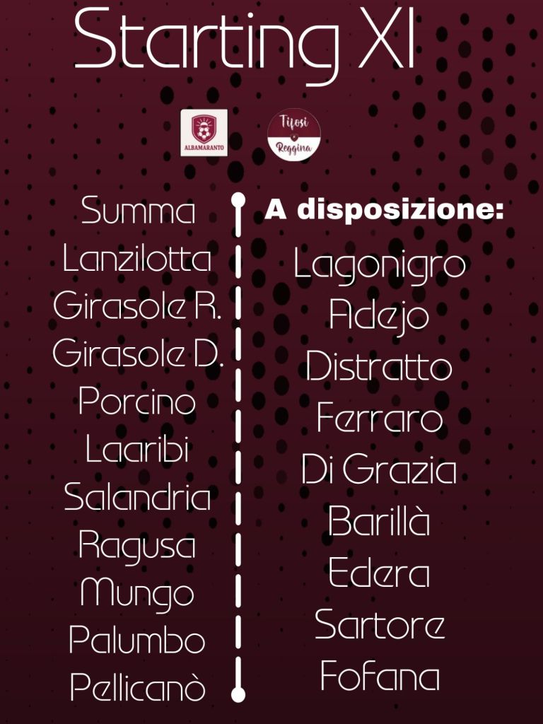 REGGINA (4-2-3-1): Summa; Lanzillotta, R. Girasole, D. Girasole, Porcino; Laaribi, Salandria; Ragusa, Mungo, Palumbo; Pellicanò. All. Torrisi